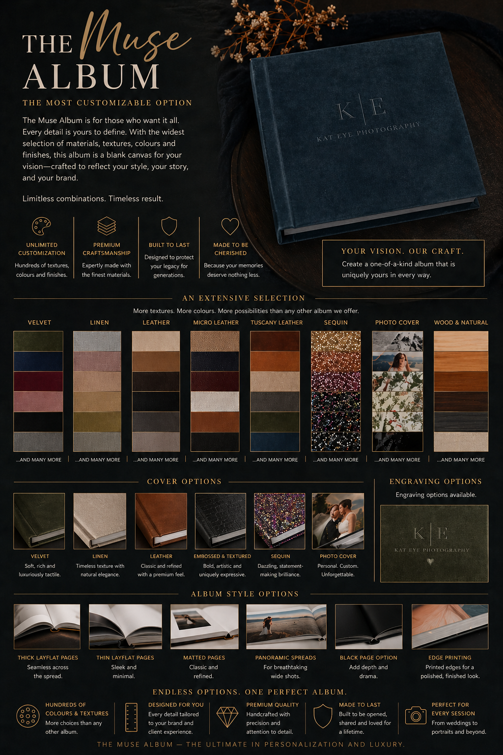 The Muse Album is our most customizable piece—designed for those who don’t want limits, only possibilities. With an expansive range of textures, finishes, and tones, every detail is yours to define. Soft or structured, minimal or bold, refined or untamed—this album becomes whatever you need it to be.