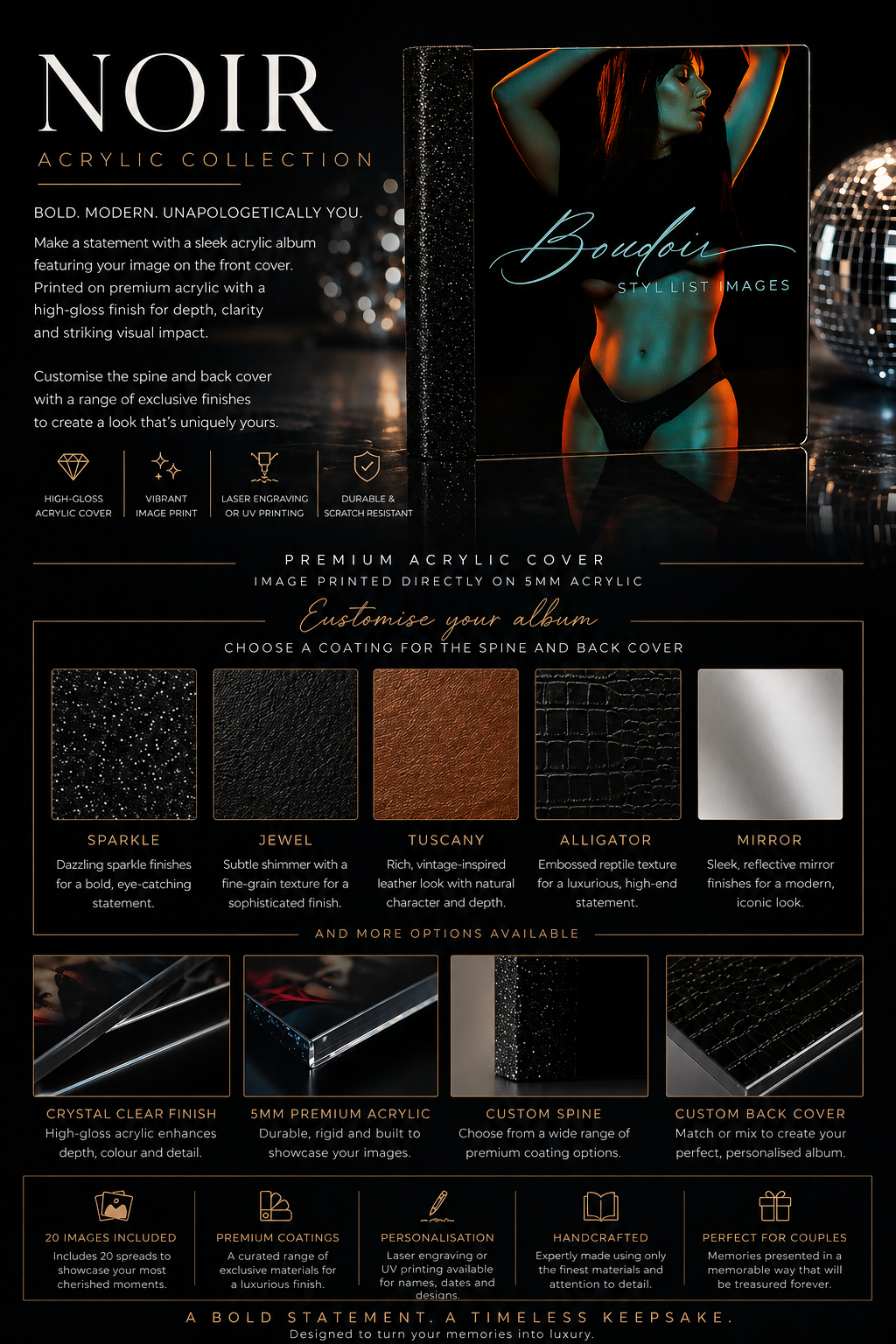 The Noir Acrylic Collection is defined by contrast—crystal-clear acrylic paired with rich, tactile finishes to create something bold, modern, and undeniably elevated. Your image is printed directly onto premium 5mm acrylic, producing exceptional depth, clarity, and a high-gloss finish that feels almost dimensional. Every detail is sharpened. Every tone is intensified.