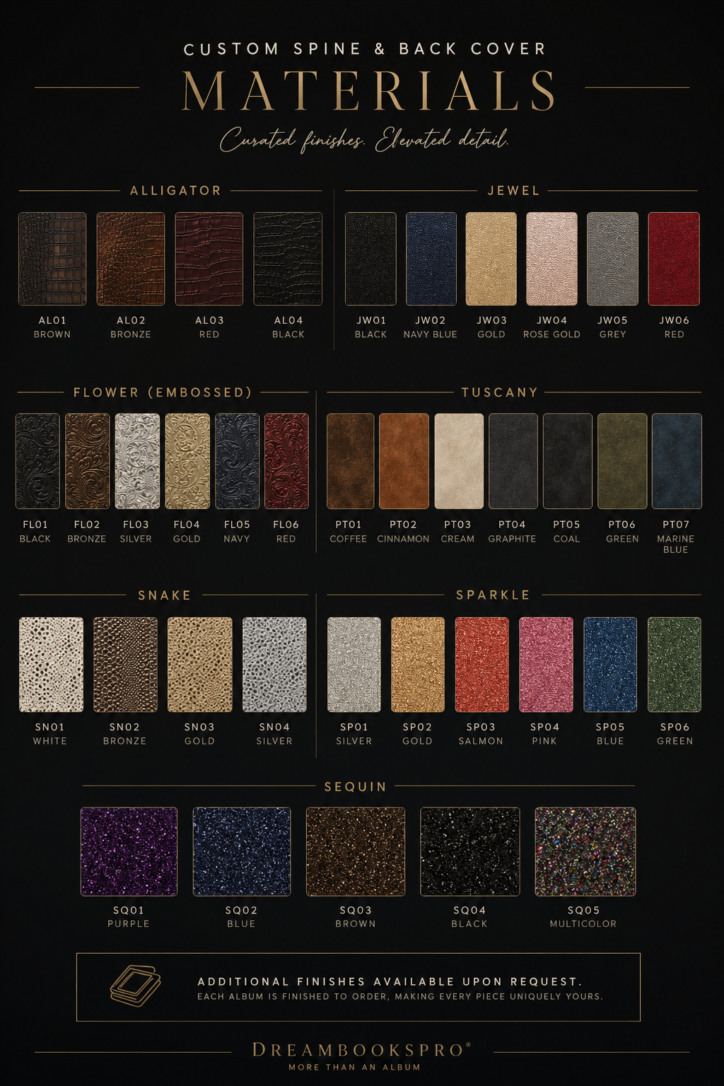 The acrylic cover is paired with a fully customizable spine and back cover, allowing you to choose from a curated range of luxury materials—from subtle, refined textures to more dramatic, statement finishes. Each selection adds weight, character, and a distinct edge to the final piece.